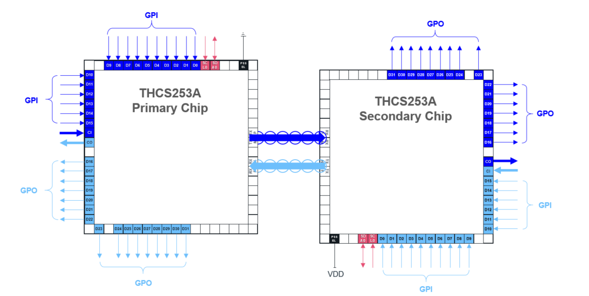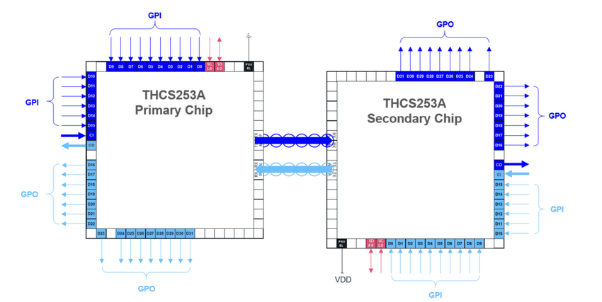 具體來說,將THCS253A/THCS254A應用到電子設備時,準備兩個相同的芯片 (IC),並使用PSSEL端子指定一個作為Primary Chip,另一個作為Secondary Chip。對THCS253A,可處理的最大GPIO數量為32條;對於THCS254A,可處理的最大GPIO數量為20條。例如,THCS253在Default情況下,設置為GPI(汎用輸入)16條和GPO(汎用輸出)16條(圖 1)。