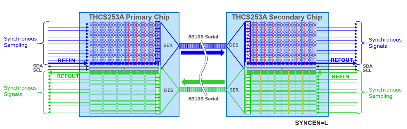 接下來我們談談另一個大的變化,同步/非同步模式的導入。既有產品THCS251/THCS252只能使用同步模式,而這款THCS253A/THCS254A現在可以使用同步和非同步模式。用戶可以使用Secondary Chip上的端子設定來選擇使用模式。