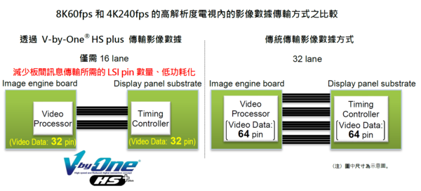 V-by-One® HS plus可以實現最高8Gbps/lane的傳輸速度,是過去標準技術的兩倍。除了液晶電視、OLED電視等大尺寸顯示應用對高解析度的需求外,並可支援日益增長, 超過120Hz的高刷新率需求的遊戲應用。透過機器內部傳輸電纜節省化、連接器、影像處理器IC、Timing controller IC的薄型化的小型化,為降低系統成本和功耗做出貢獻。未來,搭載V-by-One® HS plus技術的高解析度電視和顯示器產品的廣泛使用,有望為創造符合歐美新環境法規的高附加值做出貢獻。